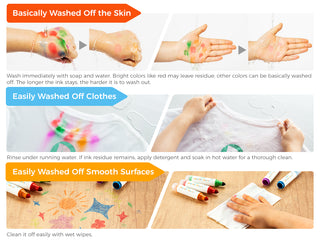 Our water-based ink is safe, non-toxic, and ASTM-D4236 certified, making it perfect for little artists! No need to worry about messy stains—if your child gets ink on the table, clothes, or skin, it easily washes off with water or mild detergent.